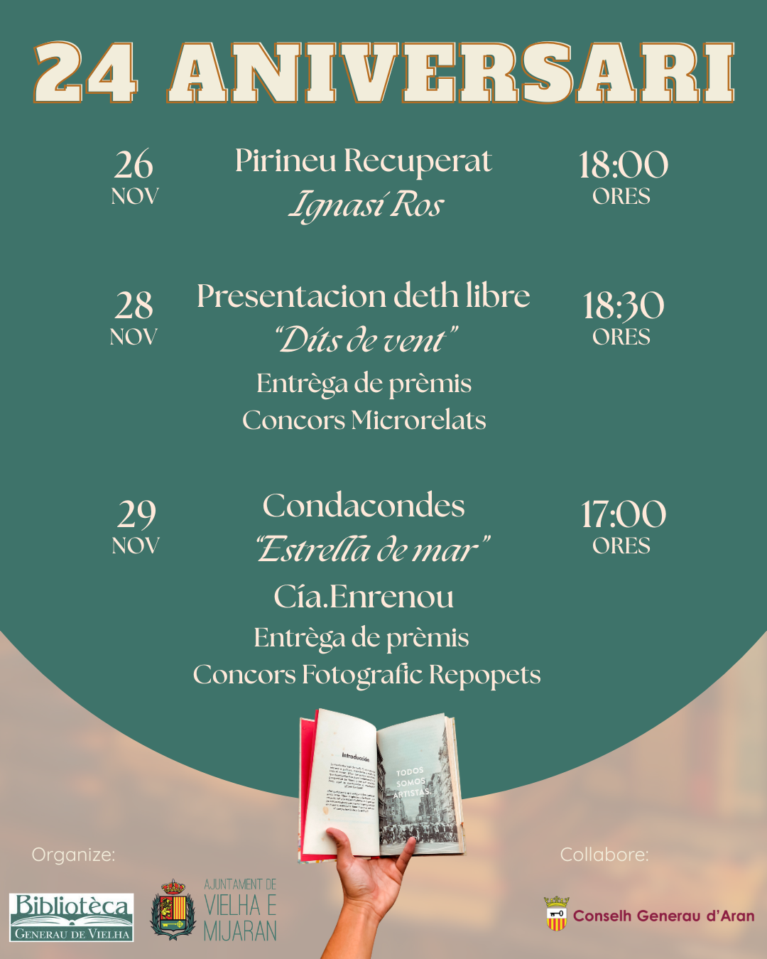 Era Bibliotèca Generau de Vielha se trape de celebracion, en tot commemorar eth sòn 24au aniversari. En aguest sens, deth 26 ath 29 de noveme poderatz gaudir de desparières activitats ena installacion municipau, damb: liurament de prèmis des concorsi abituaus, projeccion de pellicules, condacondes e fòrça mès activitats entà tot tipe de publics.