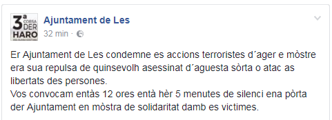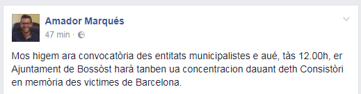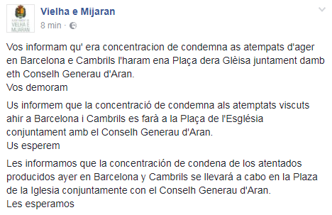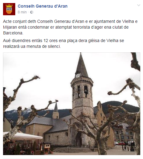 Era Val d'Aran se solidarize damb es victimes e familhes que patiren ager es terribles atacs terroristes en Barcelona e Cambrils.