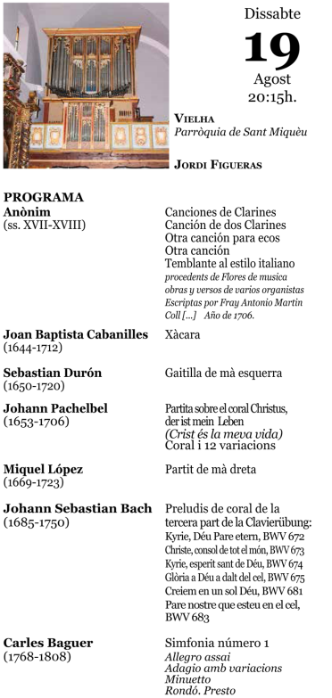 Aguest dissabte, 19 d'agost, tàs 20:15 ores arribe a Vielha eth XXXVII cicle de "Els Orgues de Catalunya".