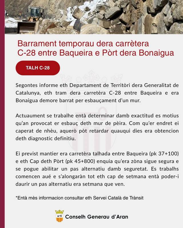 Segontes informe eth Departament de Territòri dera Generalitat de Catalunya, eth tram dera carretèra C-28 entre Baqueira e era Bonaigua demore barrat per esbauçament d’un mur.
