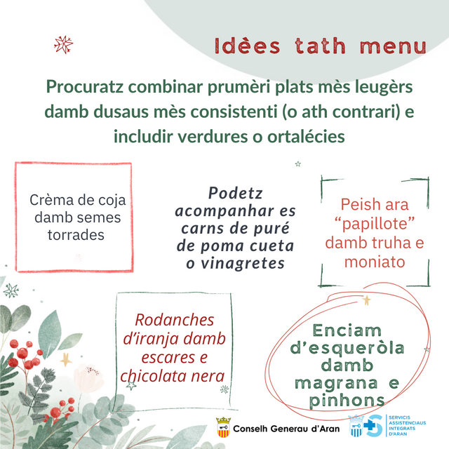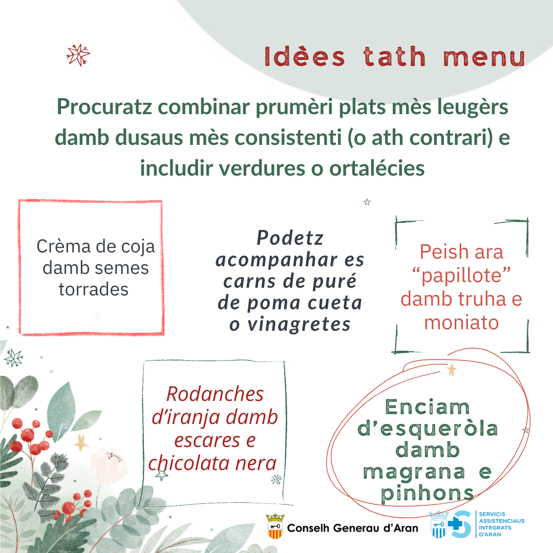 Arribe Nadau, qu’ei un moment entà compartir e gaudir, tanben ath torn dera taula. Damb er objectiu de previer molèsties digestives e mantier un avient estat de salut vos facilitam quauques recomanacions realizades pera nòsta nutricionista Esther Carmona.