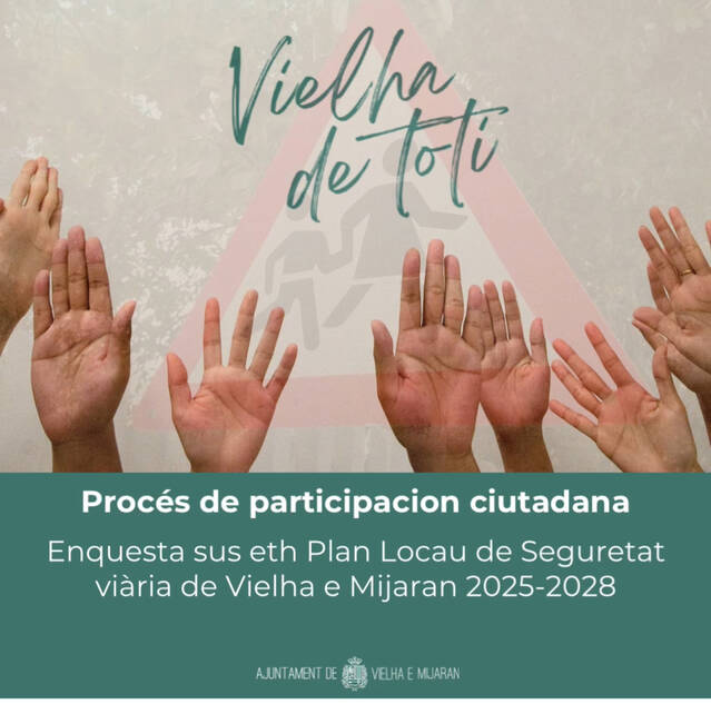 Er Ajuntament de Vielha e Mijaran a iniciat un procès de participacion publica damb er objectiu d’elaborar eth tèxte deth futur “Plan Locau de Seguretat Viària de Vielha e Mijaran 2025-2028” (PLSV), coma estrument de planificacion estrategica municipau entà auançar de cap ara “Vision Zèro” (reduccion progressiua des victimes mortaus e grèus) e milhorar era seguretat de toti es usatgèrs, damb especiau atencion as collectius mès vulnerables (pedons, ciclistes e usatgèrs de VMP).