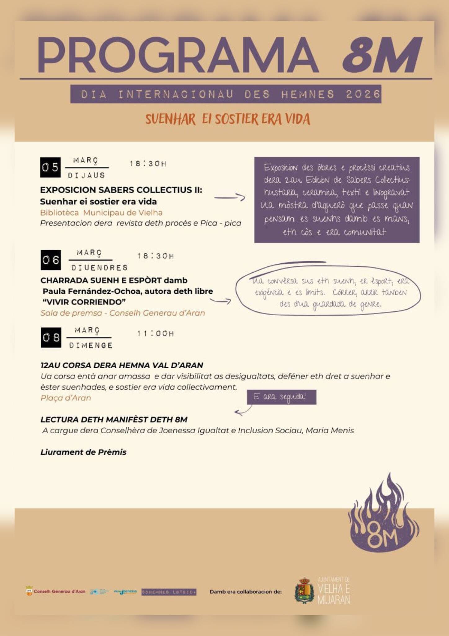 Entà acabar, eth 8 de març, tàs 11.00, damb gessuda e arribada ena Plaça d’Aran, se harà era 12au Corsa dera Hemna dera Val d’Aran. Ua corsa que ja ei un classic d’aguesta jornada reivindicativa e que sage d’amassar e visibilizar es desigualtats, deféner eth dret a cuedar e a èster cuedades, e sostier era vida collectivament. E, en acabar era corsa, era conselhèra de Joenessa, Igualtat e Inclusion Sociau, Maria Menis, liegerà eth manifèst deth 8-M e, tà barrar es actes d’enguan, se liuraràn es prèmis dera corsa.
