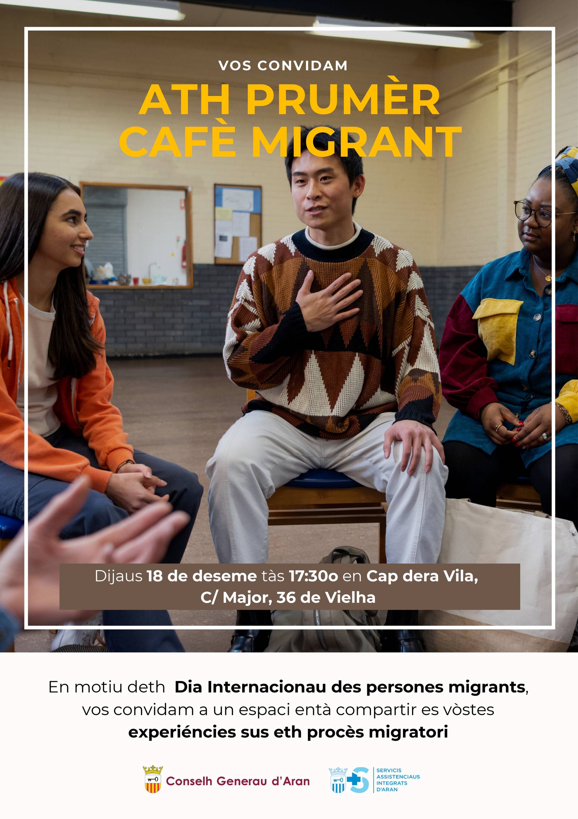 En marc deth Dia Internacionau des Persones Migrantes, que se celèbre eth 18 de deseme, d’ençà deth servici pes Drets deth Conselh Generau d’Aran vos convidam ath “Cafè Migrant”, un espaci segur, pròplèu e participatiu a on compartir experiéncies, emocions e reflexions sus eth procès migratòri.