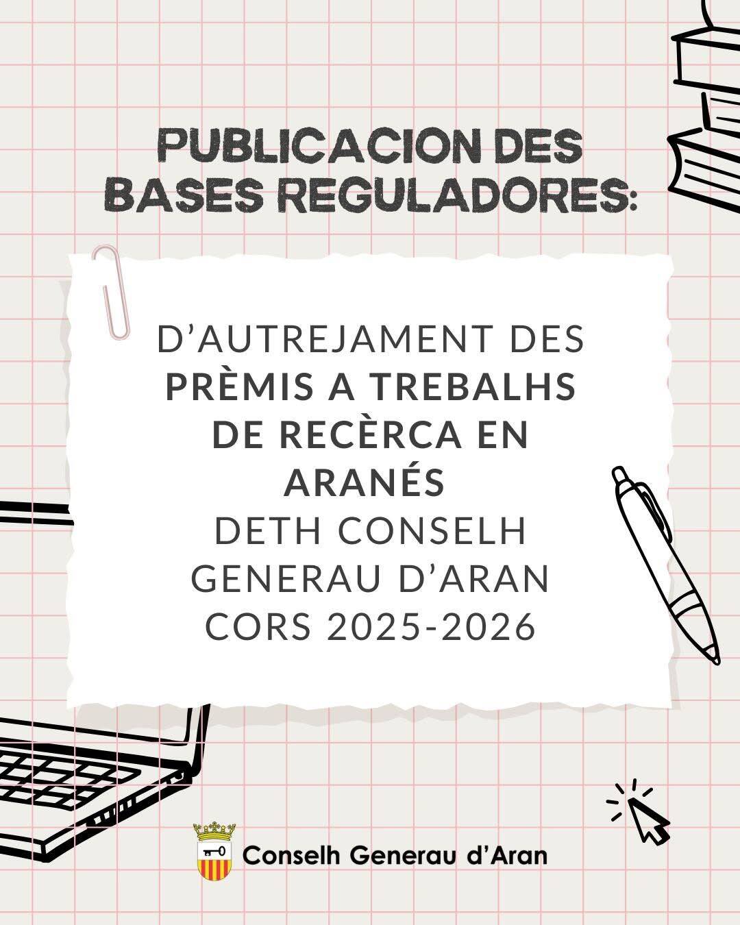 Eth Conselh Generau d’Aran a hèt a conéisher es bases reguladores qu'an de regir er autrejament des Prèmis deth Conselh Generau d’Aran entàs Trebalhs de Recèrca en aranés, corresponents ara 5au edicion (cors 2025-2026)